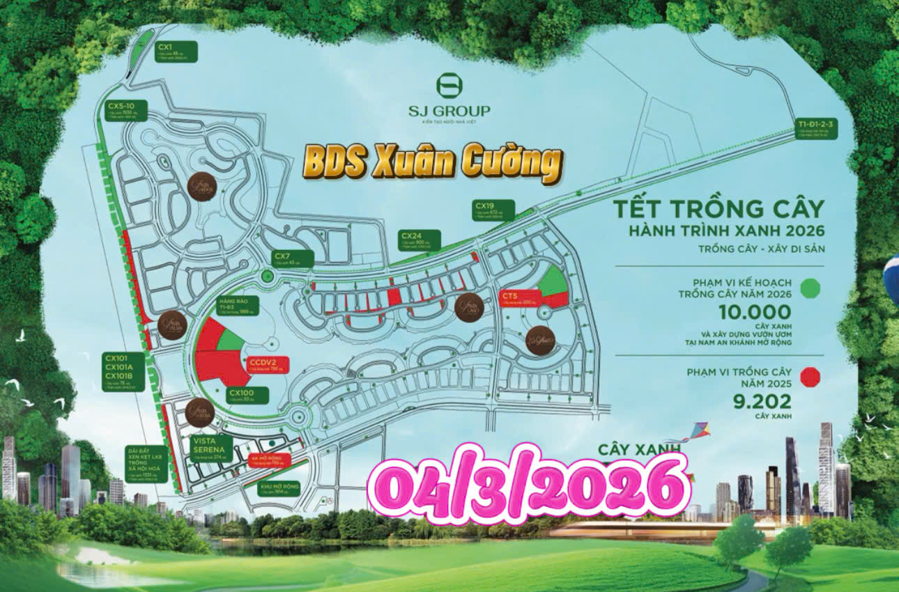 Ngay sau Tết Nguyên đán 2026 , SJ Group đặt mục tiêu trồng mới khoảng 10.000 cây xanh tại khu vực Nam An Khánh SJ Group. Các cây xanh sẽ được phân bổ và trồng tập trung dọc các tuyến đường, khu vực cảnh quan và không gian công cộng, tăng mật độ cây xanh, sạch,chất lượng không khí tốt nhất cho toàn bộ cư dân. Kiến tạo cảnh quan đô thị bền vững, hiện đại.